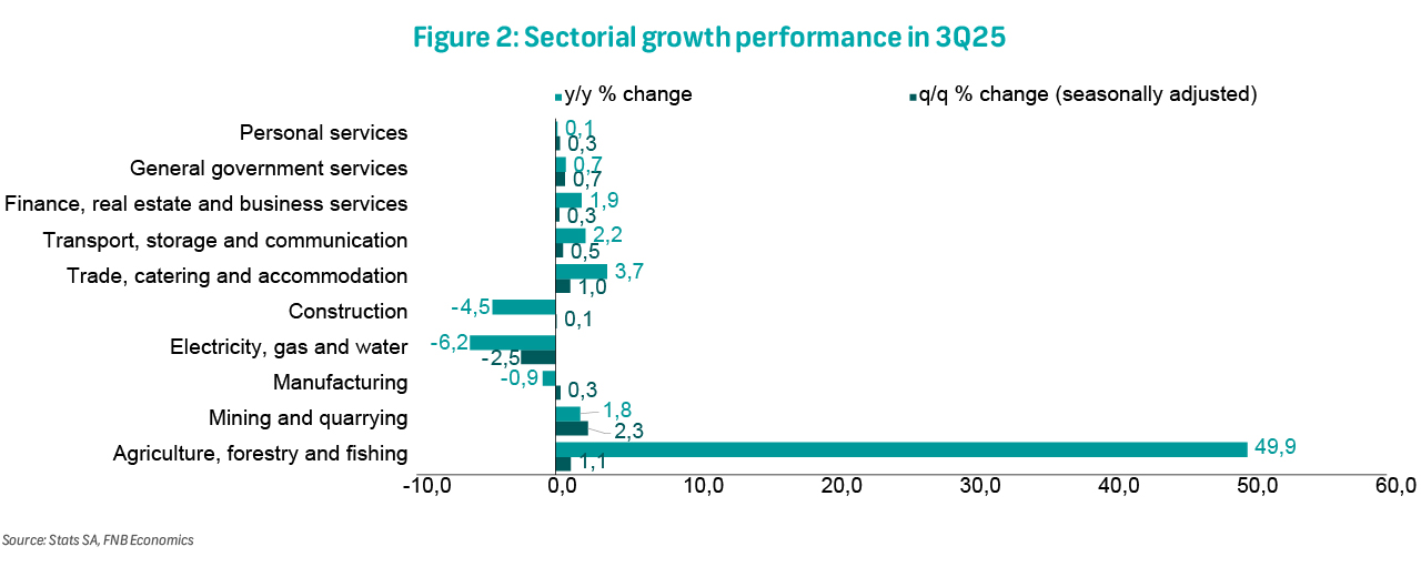 Mining; trade, catering and accommodation; finance, real estate and business services; and general government services each contributed 0.1pps to quarterly GDP growth, with q/q increases of 2.3%, 1.0%, 0.3%, and 0.7% respectively. Mining gains were driven by stronger production of PGMs, manganese ore and coal. The broader trade, catering and accommodation sector was supported by increased activity in wholesale and retail trade, motor trade, and accommodation and food services. Growth in finance, real estate and business services reflected higher activity in real estate services and other business services, while general government services benefitted from increased employment at national and provincial government levels and in extra-budgetary institutions.